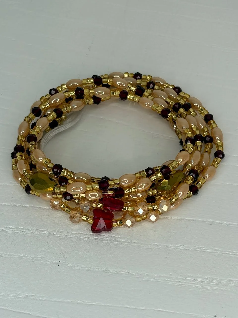 One must tie to their waist size. Use left-over string/beads for anklets.