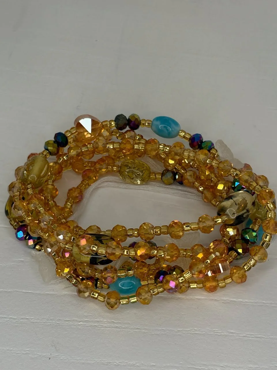 One must tie to their waist size. Use left-over string/beads for anklets.